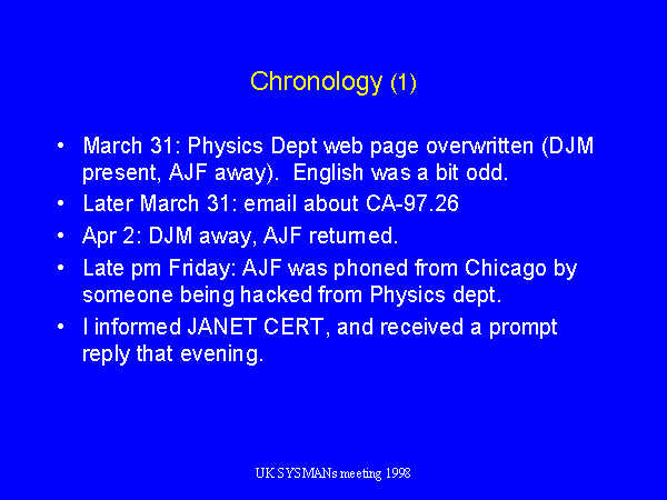 As seen from our side, the story began on the 31 March. I was away, but an email informed me that DJM was dealing with a situation in which the Physics Dept main Welcome page had been overwritten with a replacement page. Soon afterwards a circular email arrived, notifying us of reports that discontented students were overwriting web pages, making use of the statd vulnerability described in CERT advisory CA97-26. We applied the fix at the first opportunity.