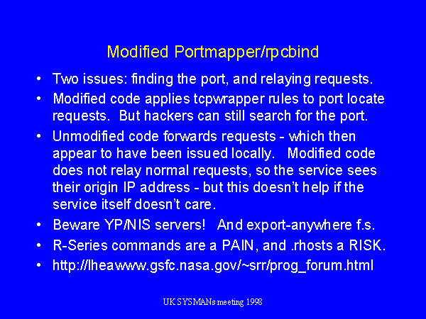Portmappers have a feature whereby they can forward a request on to the requested named service; but the service then sees the request as coming from a local source, losing the ability to have the service detect where requests are coming from. The modified version has been tamed in this respect.
