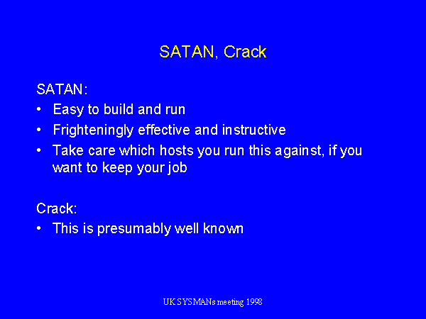 Once acquired, SATAN was easy to build and run, and frighteningly effective at pointing out our weaknesses.
