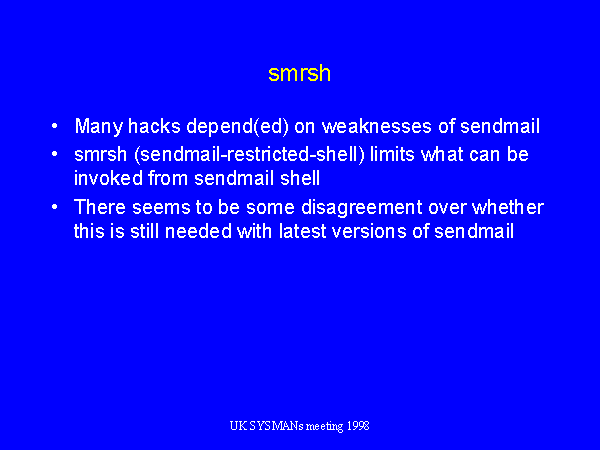 Many hacks in the past have relied upon weaknesses of sendmail, that allowed powerful shell commands to be exploited. the sendmail restricted shell, smrsh, was devised to limit the potential for damage.