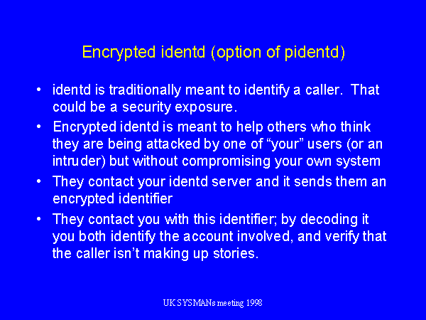 However, if a remote site believes they are under attack from one of your users (or from someone who has hacked into your site), then it can be useful if they can get some kind of handle on who is calling them. Ergo, the encrypted identd. This is an option of the widely available pidentd package.